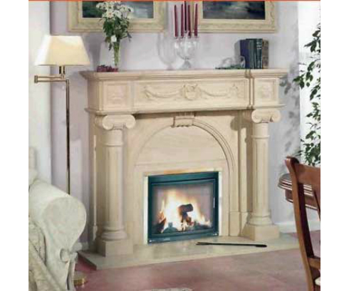 Этот поистине королевский портал выполнен из мрамора кремового цвета. Изысканные барельефы, арочное обрамление очага и строгие античные колонны превращают этот камин в настоящее произведение искусства.